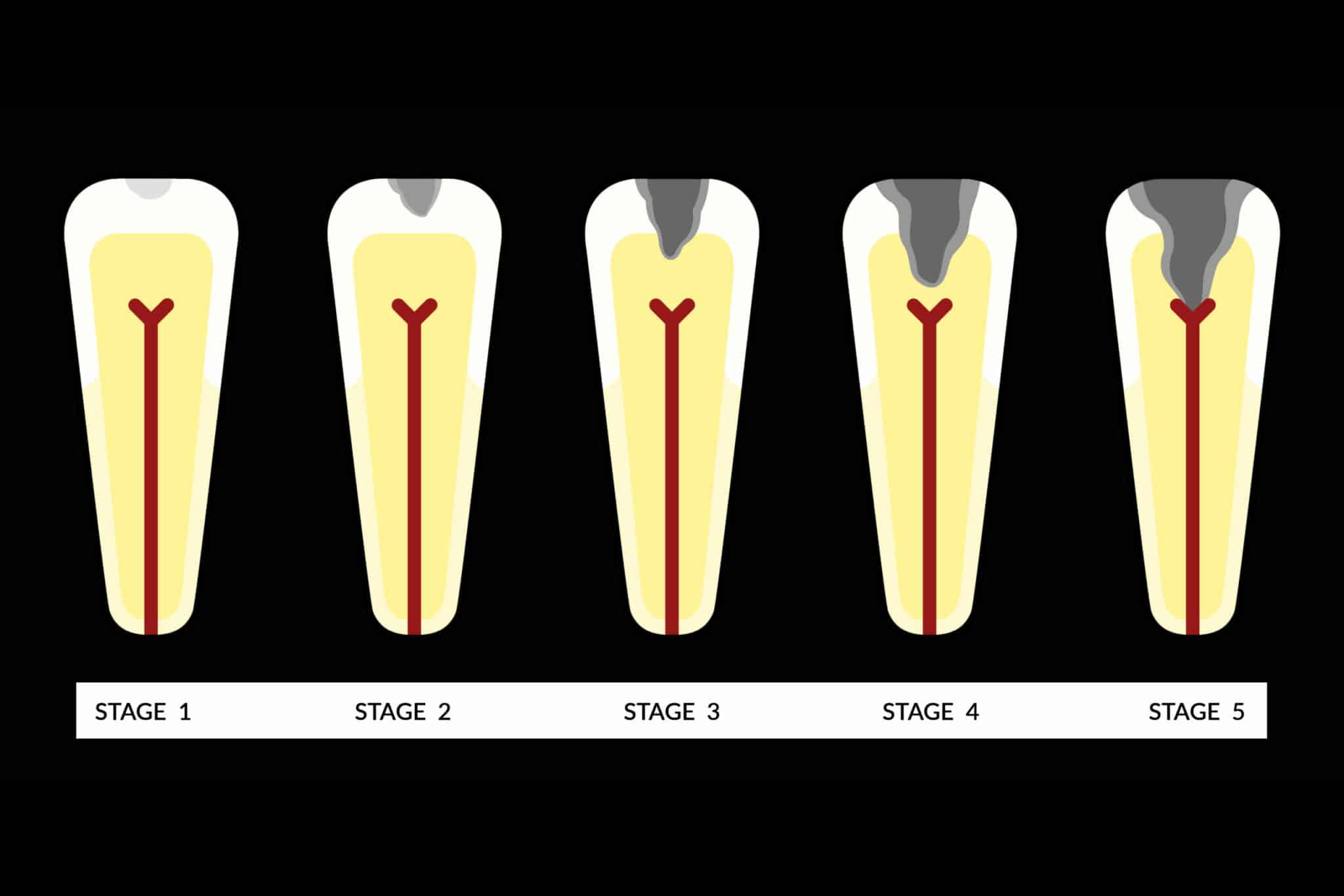 • Ved karies grad 4 har tannråten kommet lengre inn i dentinet og er nå i nærheten av tannerven.